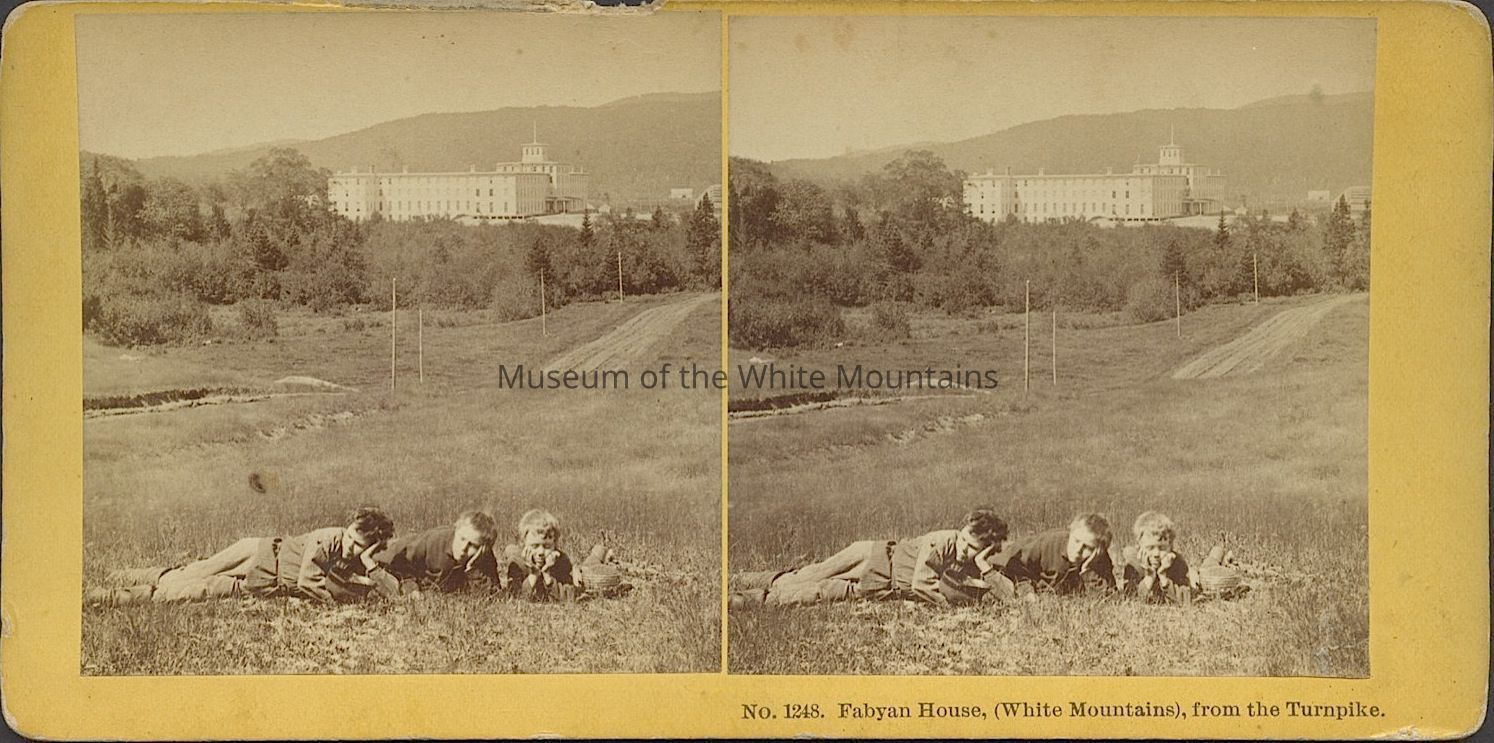 Black and white image of three children laying in the grass of a clearing. Behind them is a dirt road which leads to a large hotel with a square tower. In the background are mountains. Caption reads, "Fabyan House (White Mountains) from Turnpike." Back Description: Plain