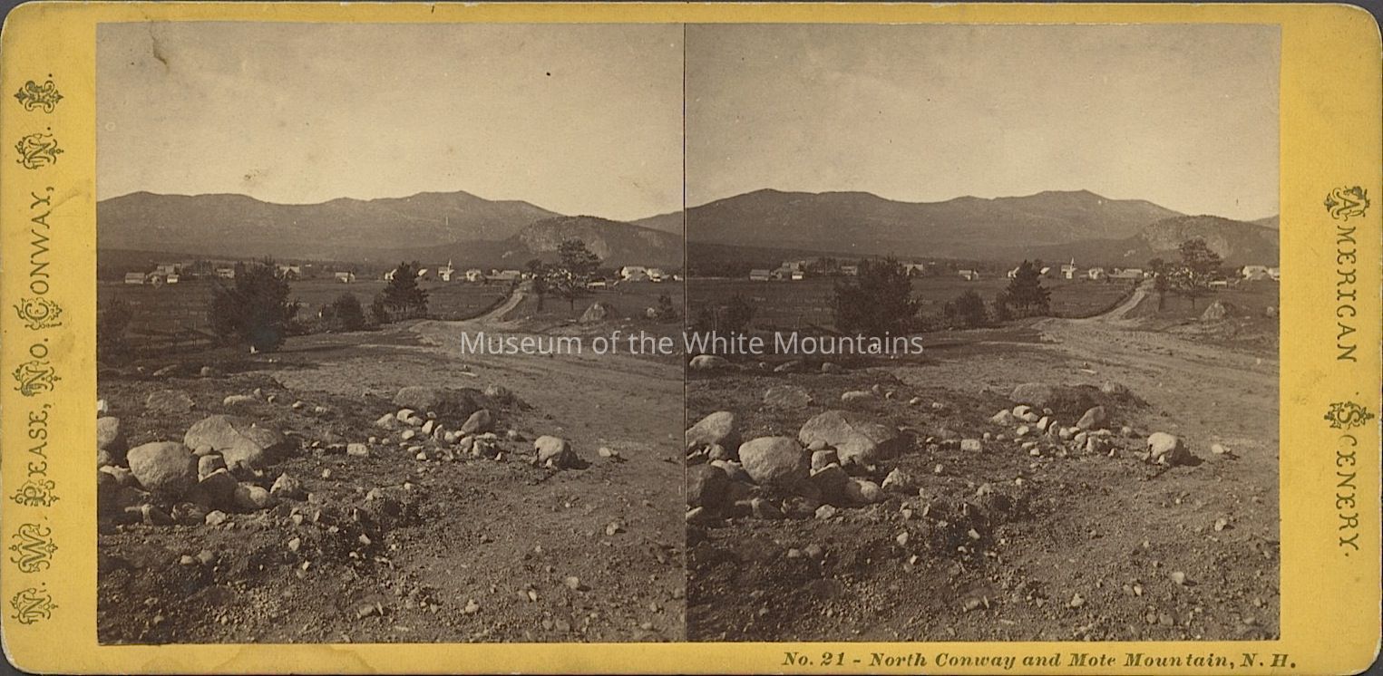 Black and white image of a rocky clearing with a dirt road leading to several buildings in the distance. In the background are mountains. Caption reads, "North Conway and Mote Mountain." Part of the "American Scenery" stereoview series. Back Description: Plain