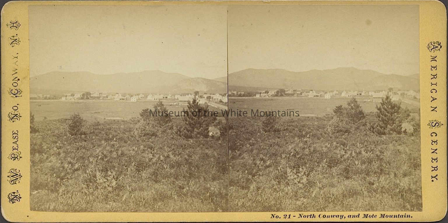 Black and white image of a clearing with a town in the distance and mountains in the background. Caption reads, "North Conway and Mote Mountain." Part of the "American Scenery" stereoview series. Back Description: Plain