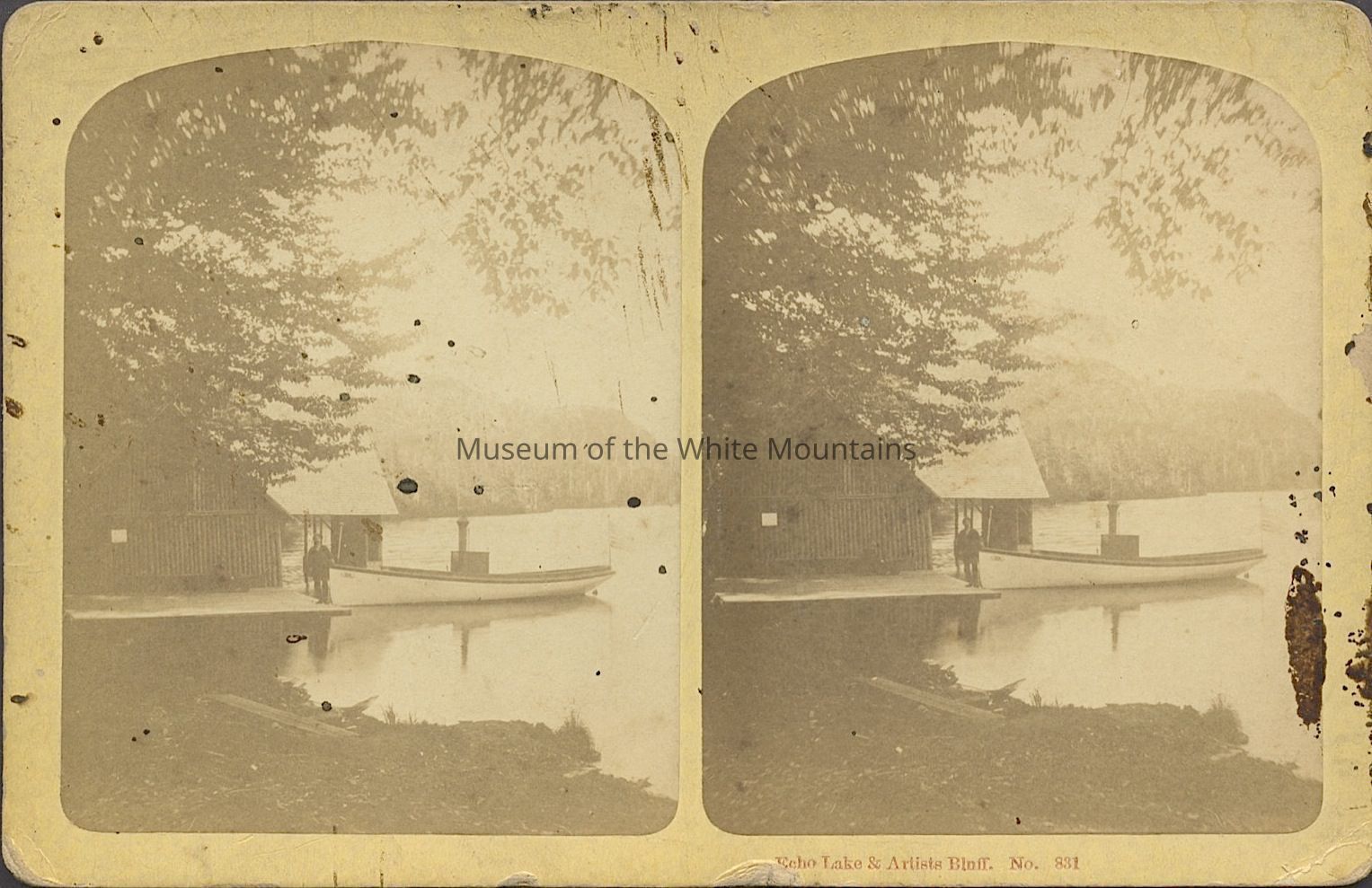 Echo Lake (Grafton county, Carroll county, New Hampshire : lake), North Conway (Carroll county, New Hampshire : inhabited place), Artists Bluff (Grafton county, New Hampshire : peak), White Mountains (New Hampshire : mountains), lakes, mountains, ledges, rowboats, docks, Buildings, people