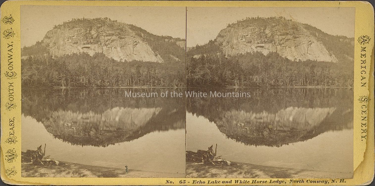 Black and white image of a lake with the mountain ledge behind it reflected. In the foreground is a sandy beach. Caption reads, "Echo Lake and White Horse Ledge, North Conway NH." Part of the "American Scenery" stereoview series. Back Description: Plain