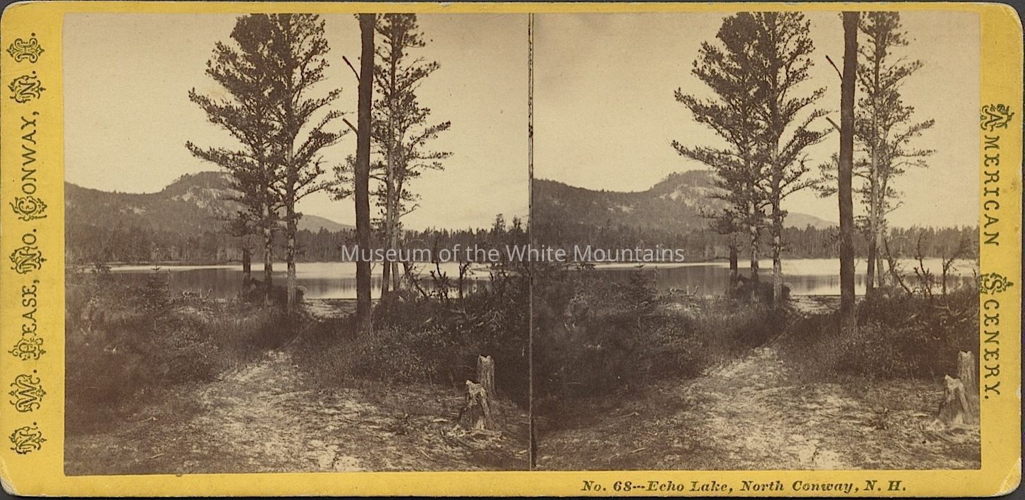 Black and white image of a path by trees with a lake and mountain ledge in the background. Caption reads, "Echo Lake North Conway NH." Part of the "American Scenery" stereoview series. Back Description: Plain