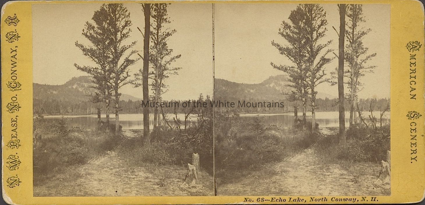 Black and white image of a path among trees with a lake and mountain ledge in the background. Caption reads, "Echo Lake North Conway NH." Part of the "American Scenery" stereoview series. Back Description: Plain