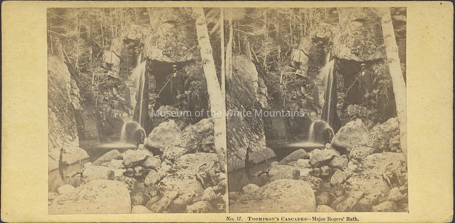 Black and white image of a waterfall among rocks and trees into a pool below. Caption reads, "Thompsons Cascades, Major Rogers Bath." Back Description: "White Mountain Scenery"