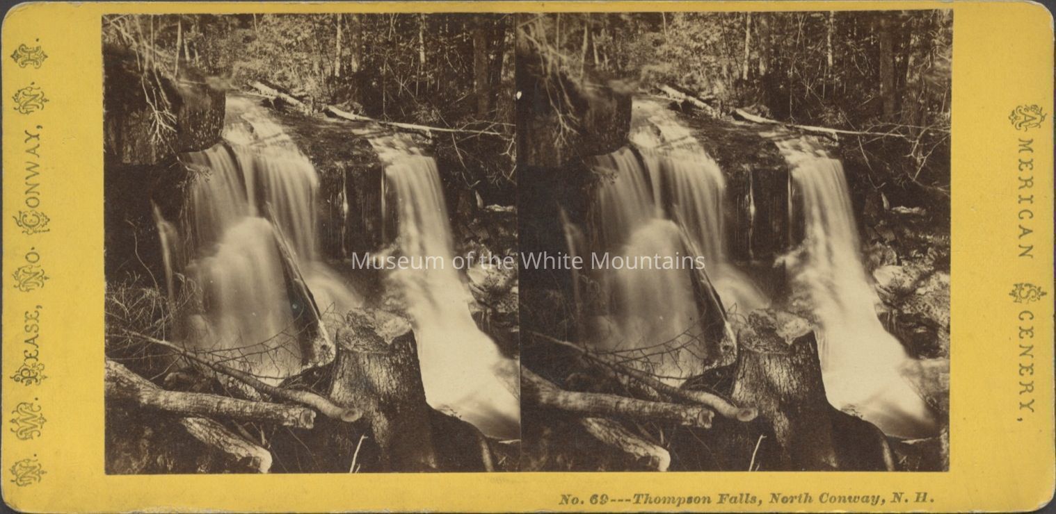 Black and white image of a waterfall among trees and rocks. Caption reads, "Thompson Falls North Conway NH." Part of the "American Scenery" stereoview series. Back Description: Plain