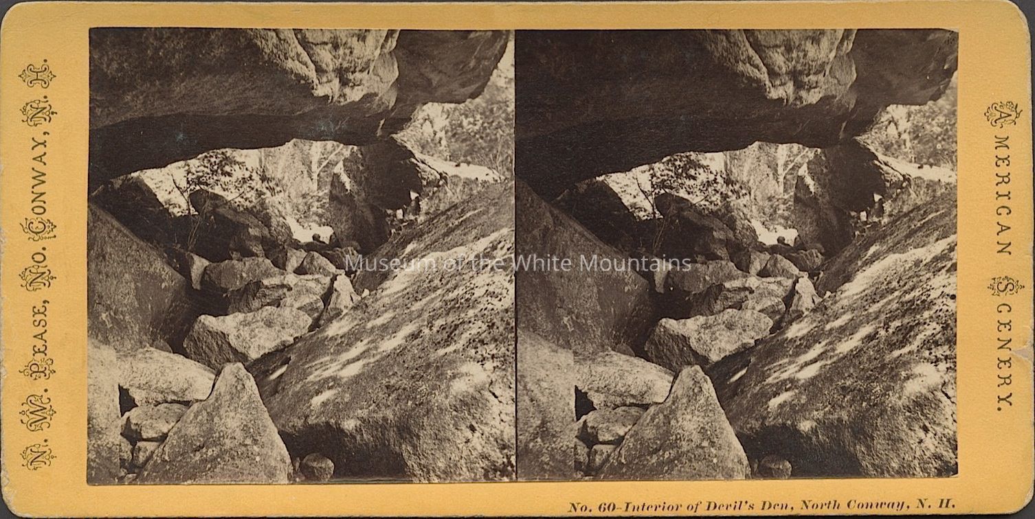 Black and white image of a rocky cave. Caption reads, "Interior of Devils Den, North Conway NH." Part of the "American Scenery" stereoview series. Back Description: Plain