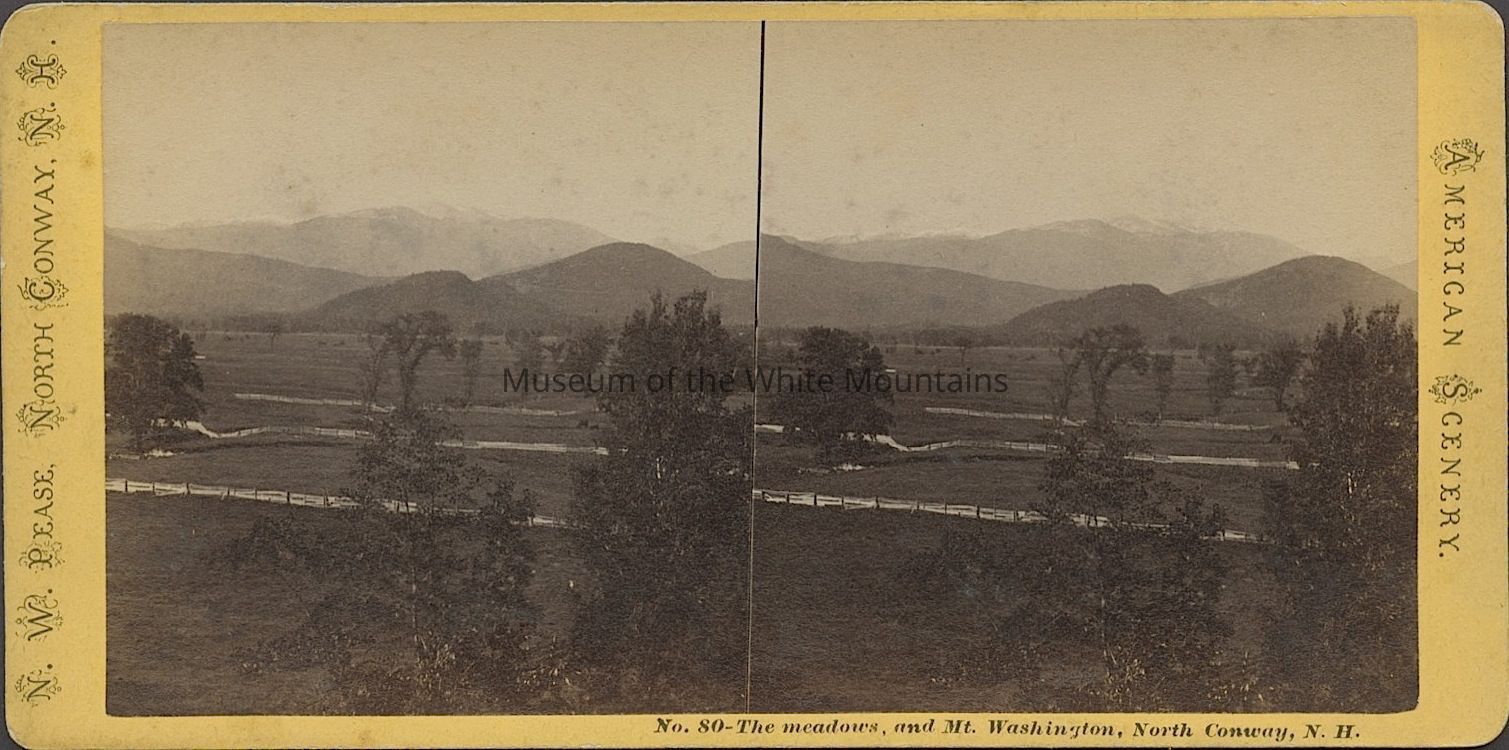Black and white image of clearings with fences and some trees and mountains in the background. Caption reads, "The meadows and Mt Washington North Conway NH." Part of the "American Scenery" stereoview series. Back Description: Plain