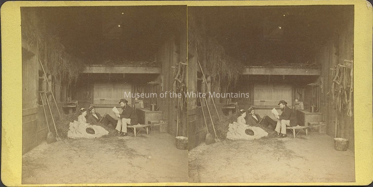 Unidentified Location, White Mountains (New Hampshire : mountains), barns, tools, people, books, hay, equipment
