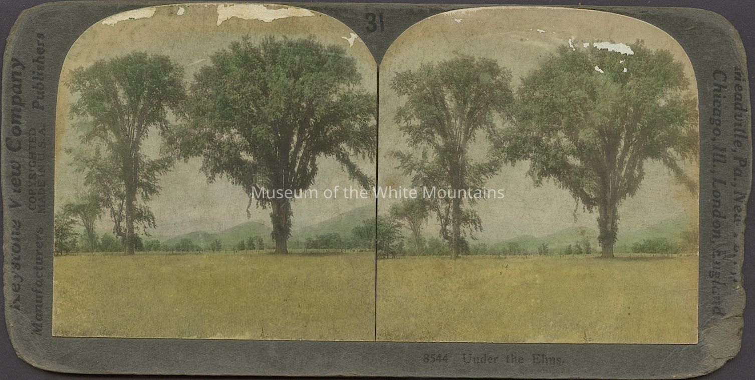 Colored image of two large trees in a clearing with mountains in the background. Caption reads, "Under the Elms." Back Description: Plain