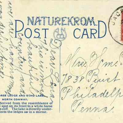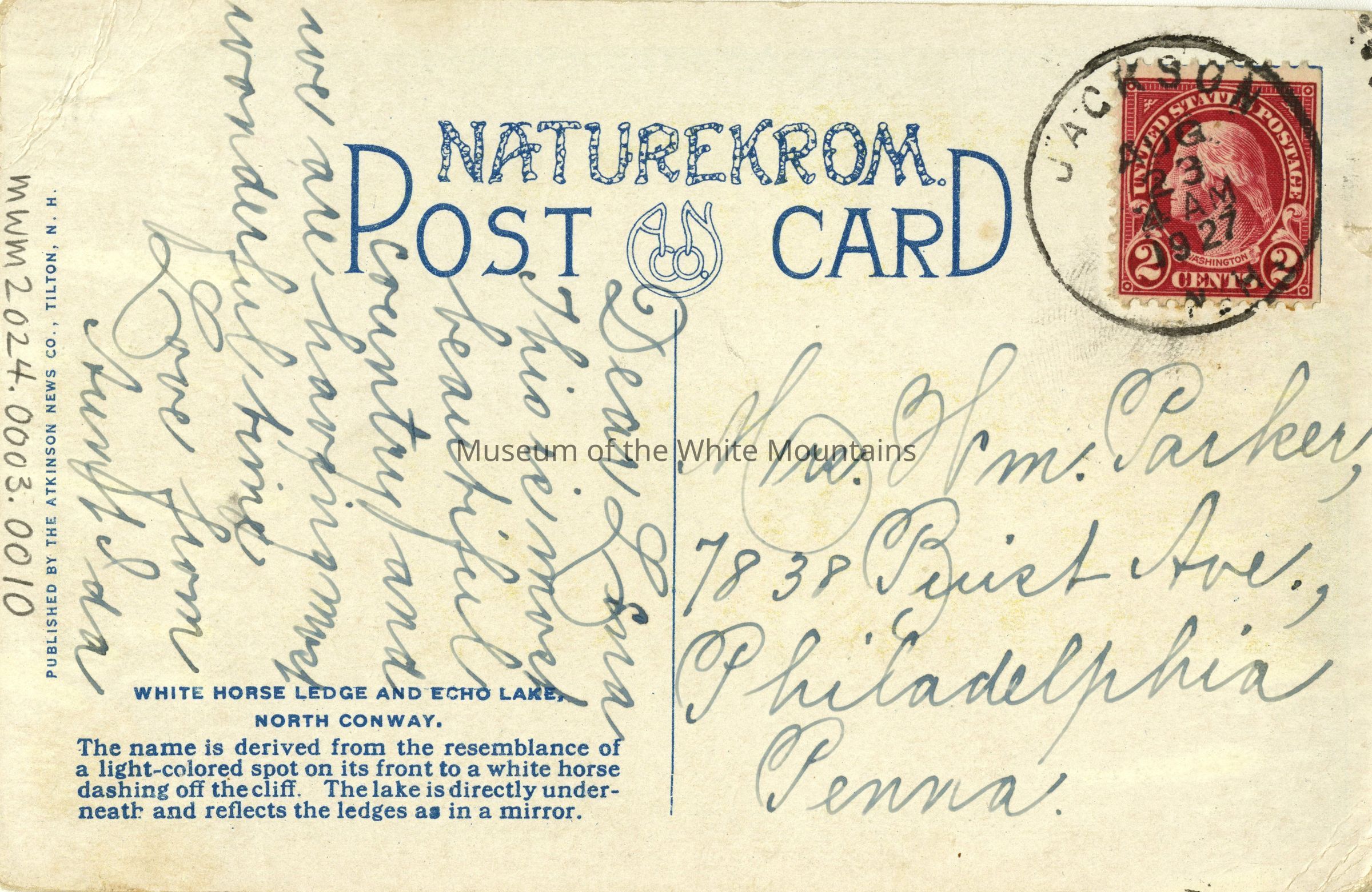 Back Description: Typical postcard back. Postmarked August 23, 1927 from Jackson, New Hampshire. Mailed to "Mrs. Wm. Parker, 7838 Buist Ave., Philadelphia, Penna."