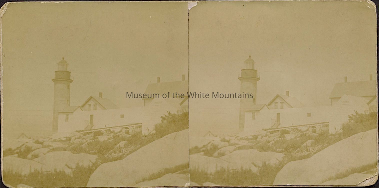 Black and white image of a lighthouse and several buildings by a rocky shore.