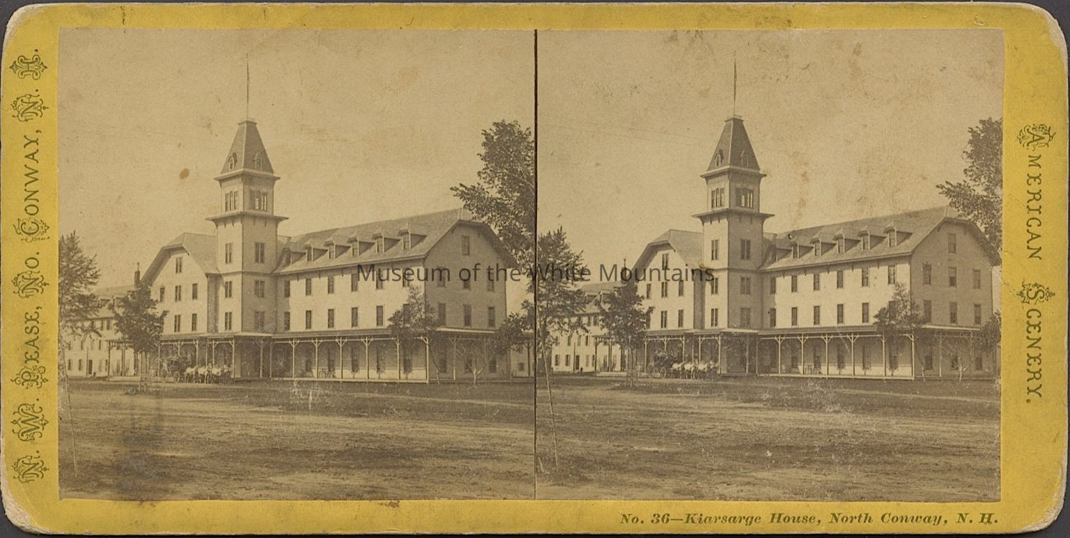 Black and white image of a hotel with a gambrel roof with many dormers and a cupola. A stagecoach is parked in front. Caption reads, "Kiarsarge House, North Conway NH." Part of the "American Scenery" stereoview series. Back Description: Plain