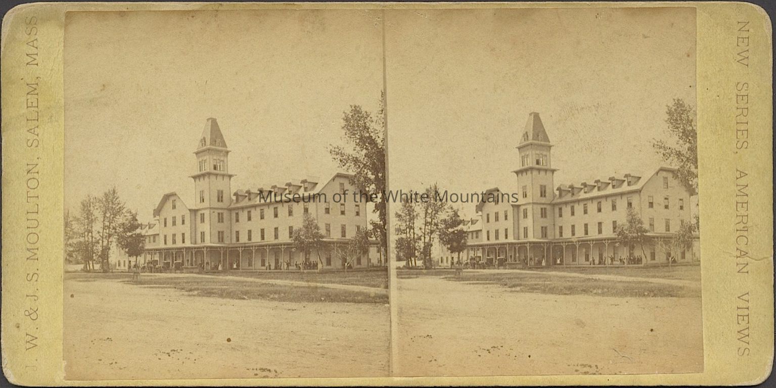 Black and white image of a hotel with a gambrel roof with many dormers and a cupola. People are on its porch and wagons are parked out front. Part of the "New Series, American Views" stereoview series.