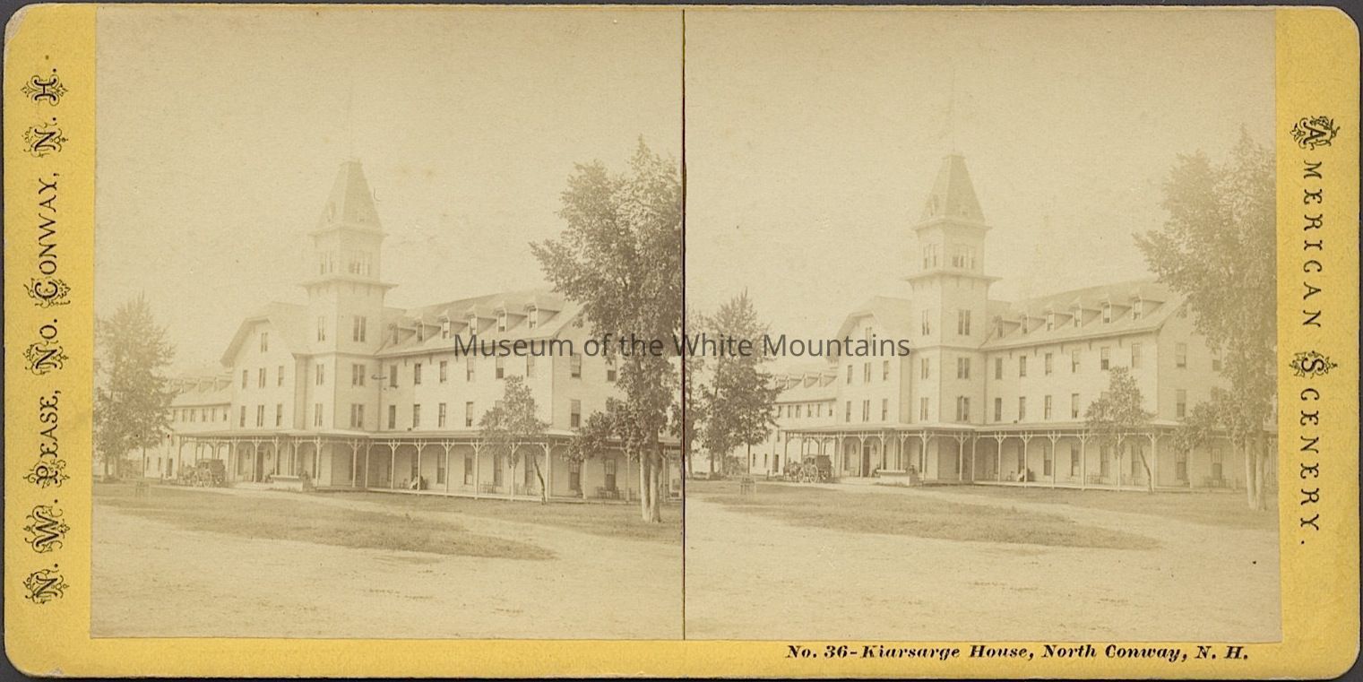 Black and white image of a hotel with a gambrel roof with many dormers and a cupola. A stagecoach is parked in front and some people are on the porch. Caption reads, "Kiarsarge House, North Conway NH." Part of the "American Scenery" stereoview series. Back Description: Plain (duplicate of MWM2010.0001.1126)