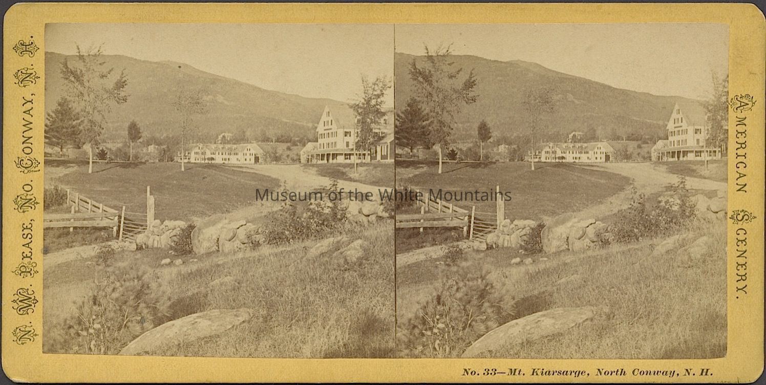 Black and white image of a dirt road in a clearing leading to several large buildings. In view are fences, trees and mountains. Caption reads, "Mt Kiarsarge North Conway NH." Part of the "American Scenery" stereoview series. Back Description: Plain