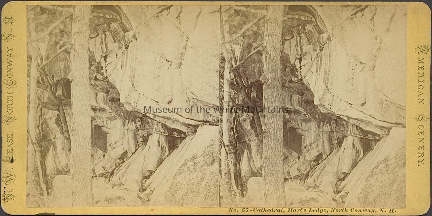 Black and white image of trees growing among large rocks and a ledge. Caption reads, "Cathedral Hart's Ledge, North Conway NH." Part of the "American Scenery" stereoview series. Back Description: Plain