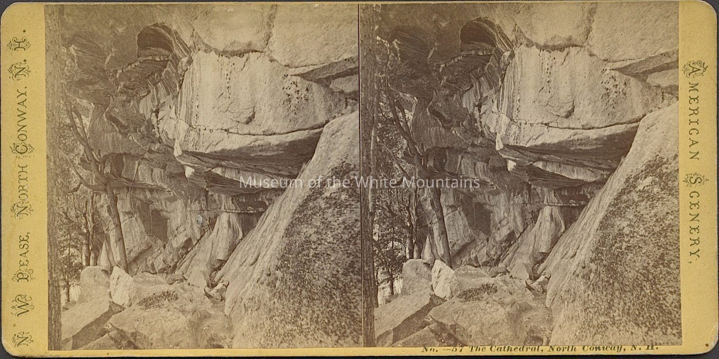 Black and white image of a ledge with trees in the background. Caption reads, "The Cathedral, North Conway NH." Part of the "American Scenery" stereoview series. Back Description: Plain. With writing.