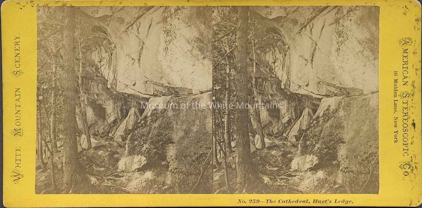 Black and white image of trees growing among large rocks and a ledge. Caption reads, "Cathedral Hart's Ledge, North Conway NH." Part of the "White Mountain Scenery" stereoview series. Back Description: Plain. Stamped.
