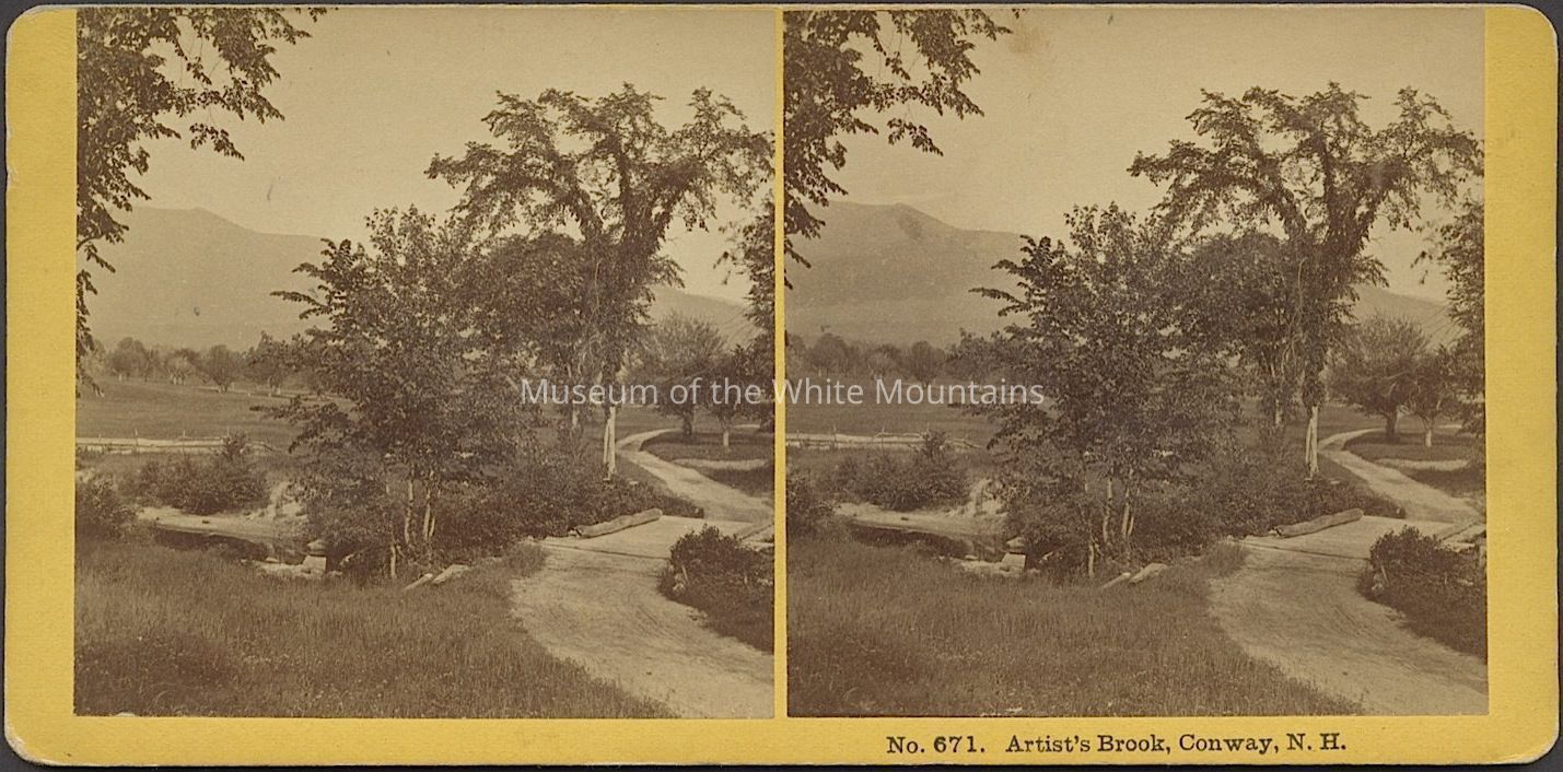 Black and white image of a dirt path and footbridge running over a small river among trees and clearings with mountains in the background. Caption reads, "Artists Book, Conway NH." Back Description: Plain. A paper had been attached covering publisher information, but partially torn off.
