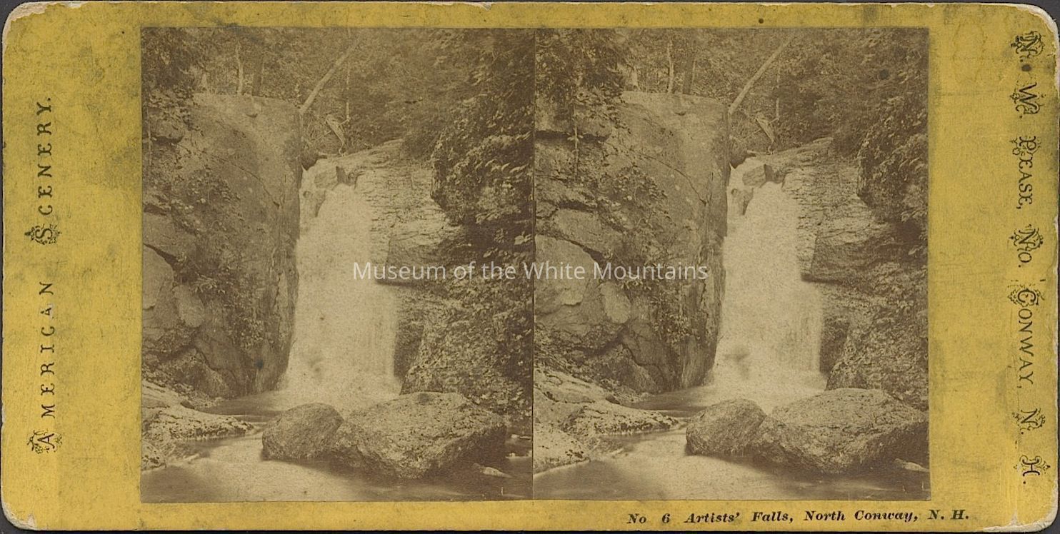 Black and white image of a waterfall among rocks and trees into a pool below. Caption reads, "Artists Falls, North Conway NH." Part of the "American Scenery" stereoview series. Back Description: Plain