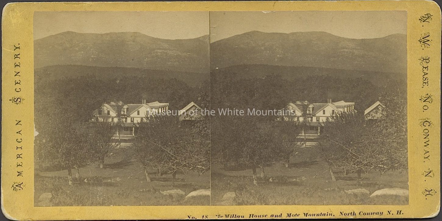 Black and white image of a large boarding house with at lease two gables and many dormers as well as a porch. A smaller building, a barn or stable, is in view. In the background are mountains. Caption reads, "McMillan House and Mote Mountain, North Conway N H." Part of the "American Scenery" stereoview series.