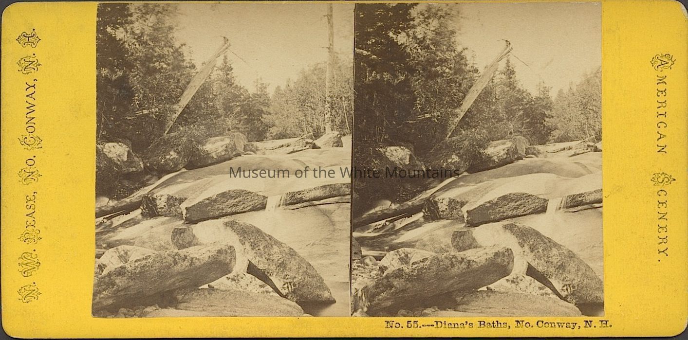 Black and white image of running water among rocks and trees. Caption reads, "Diana's Baths, No. Conway NH." Part of the "American Scenery" stereoview series. Back Description: Plain