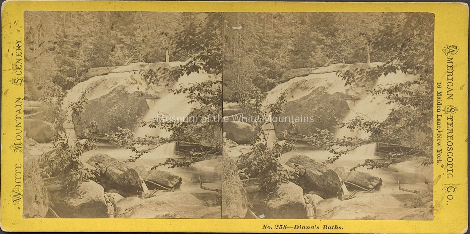 Black and white image of a waterfall among rocks and trees into a pool below. Caption reads, "Dianas Baths." Part of the "White Mountain Scenery" stereoview series. Back Description: Plain. Stamped.