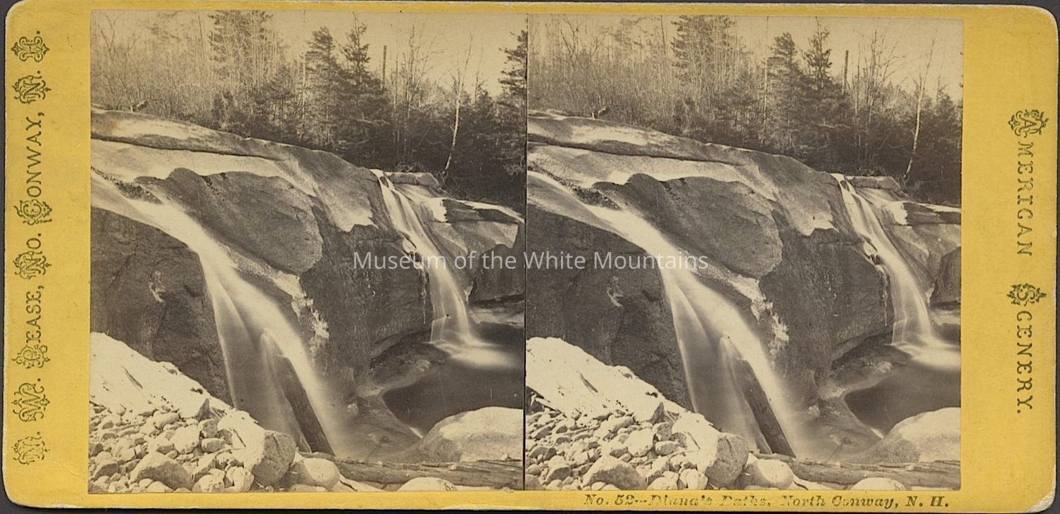 Black and white image of waterfalls among large rocks and trees. Caption reads, "Diana's Baths, North Conway NH." Part of the "American Scenery" stereoview series. Back Description: Plain