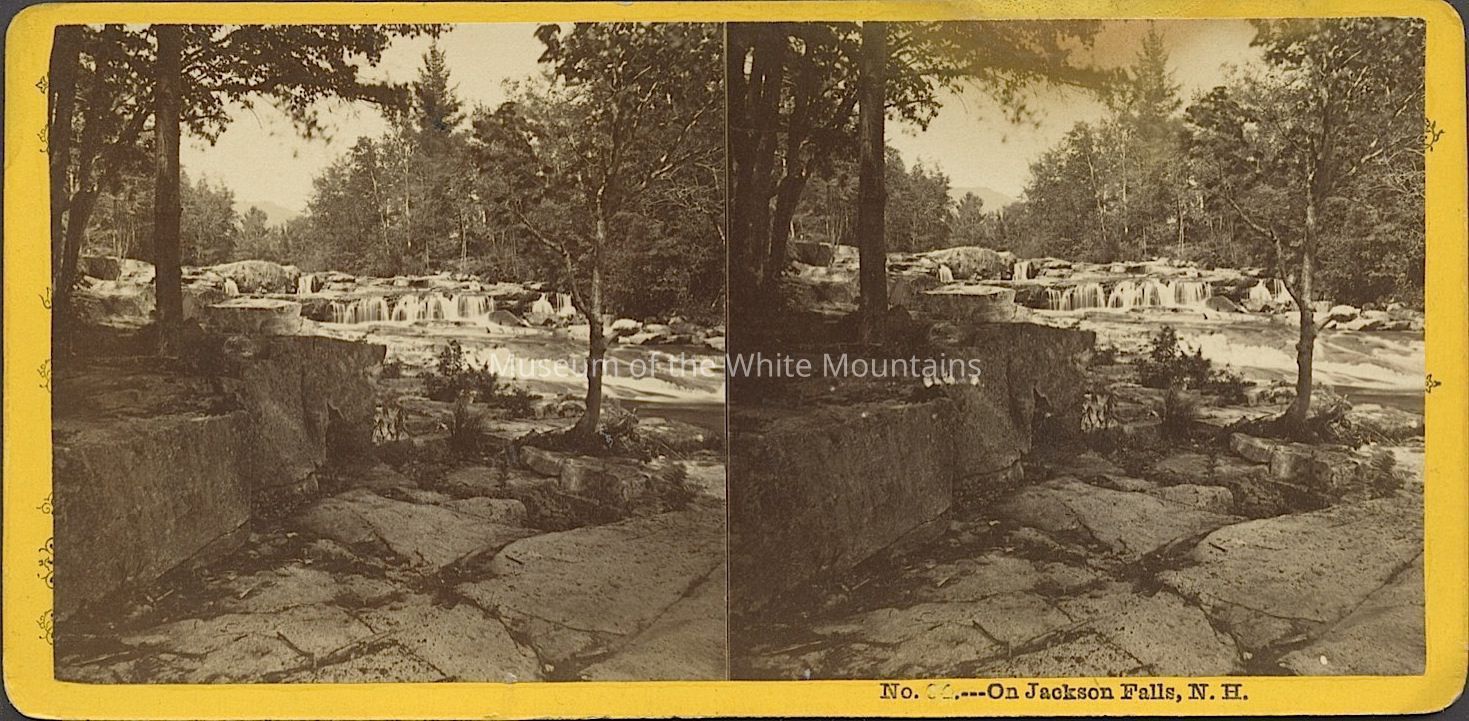 Black and white image of a waterfalls over rocks and among trees. Caption reads, "On Jackson Falls, NH." Part of the "American Scenery" stereoview series. Back Description: Plain. With writing.