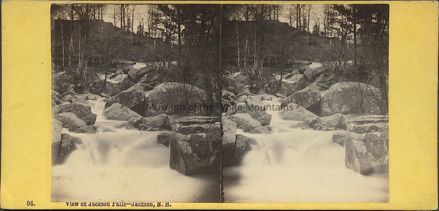 Black and white image of rushing water among rocks and trees. Caption reads, "View on Jackson Falls, Jackson NH." Part of the "American Scenery" stereoview series. Back Description: Plain. With a postage stamp.
