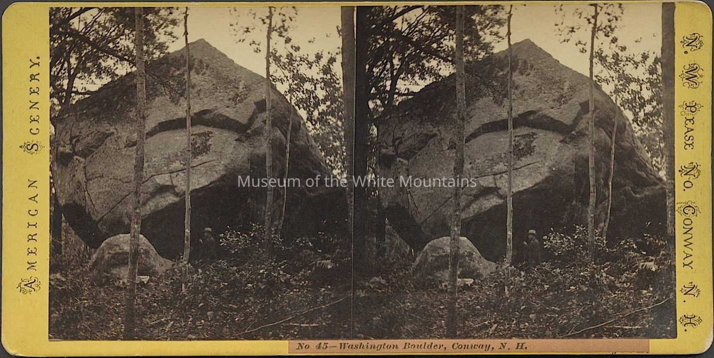 Black and white image of a large boulder among small trees. Caption reads, "Washington Boulder, Conway NH." "American Scenery" Back Description: Plain