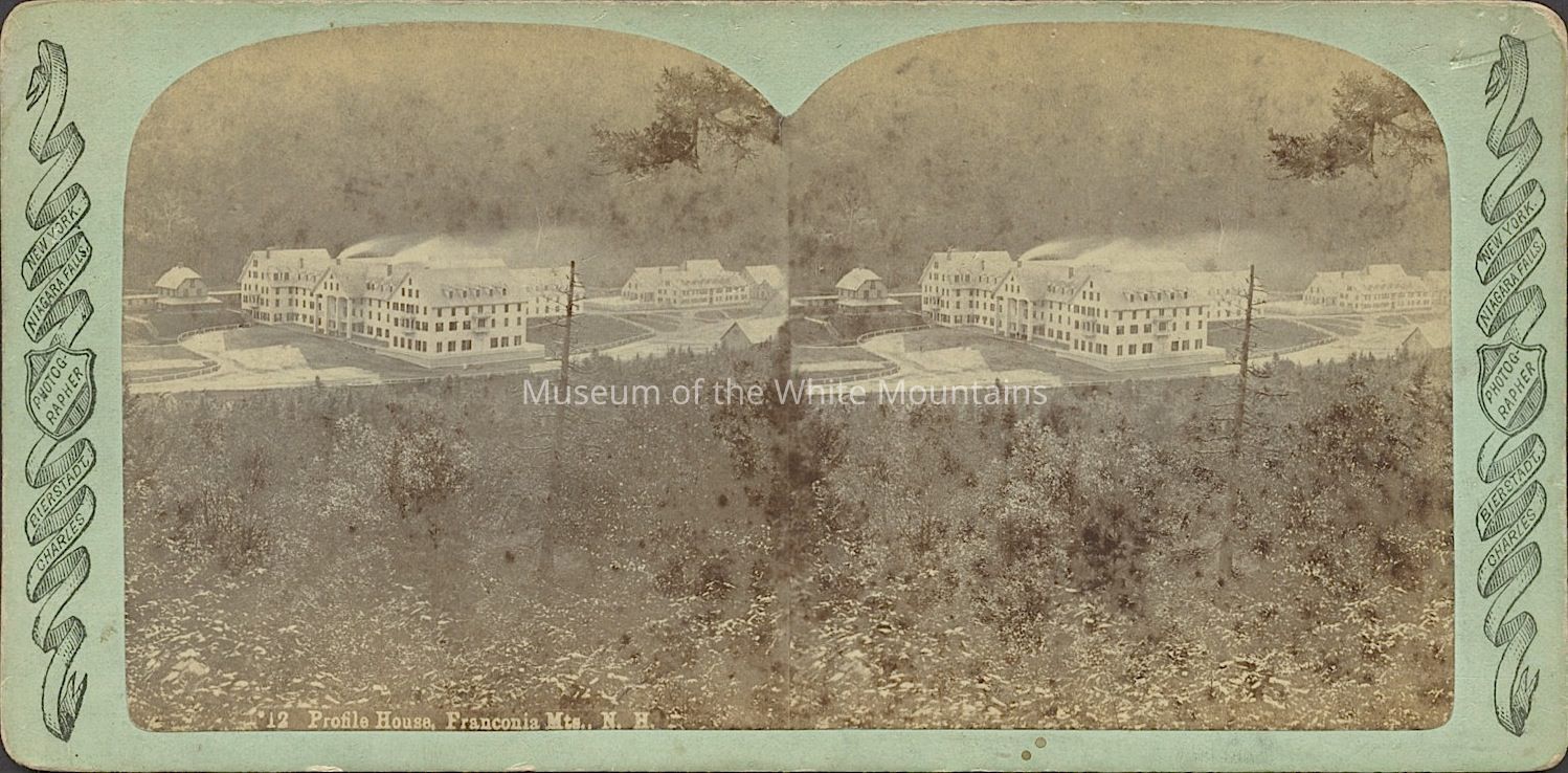 Black and white image of a large hotel with several dormers and gables. It is surrounded by dirt paths and several smaller buildings. In the background is a mountainside. Caption reads, "Profile House, Franconia Mts. NH." Back Description: Plain