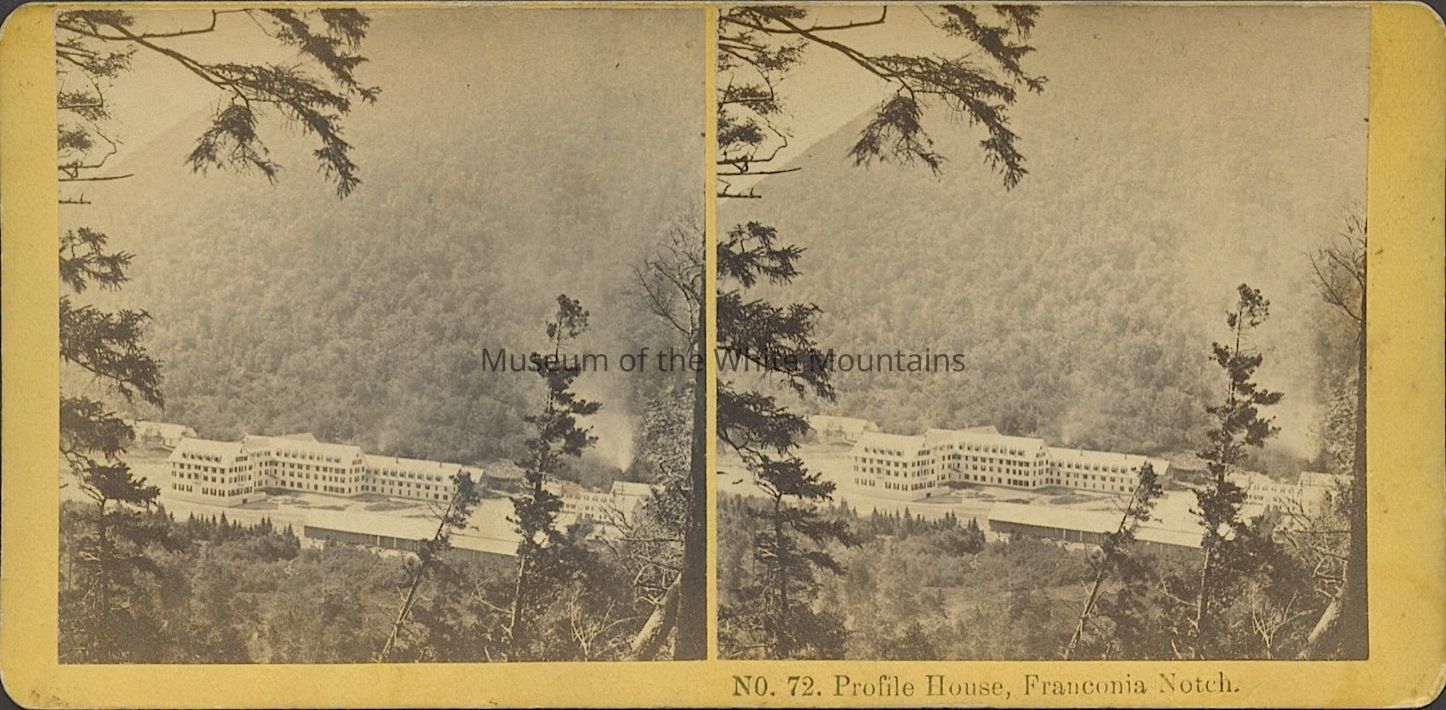 Black and white image of a large hotel with many dormers and gables. It is surrouned by smaller buildings and clearings and mountains. Caption reads, "Profile House, Franconia Notch." Back Description: Plain