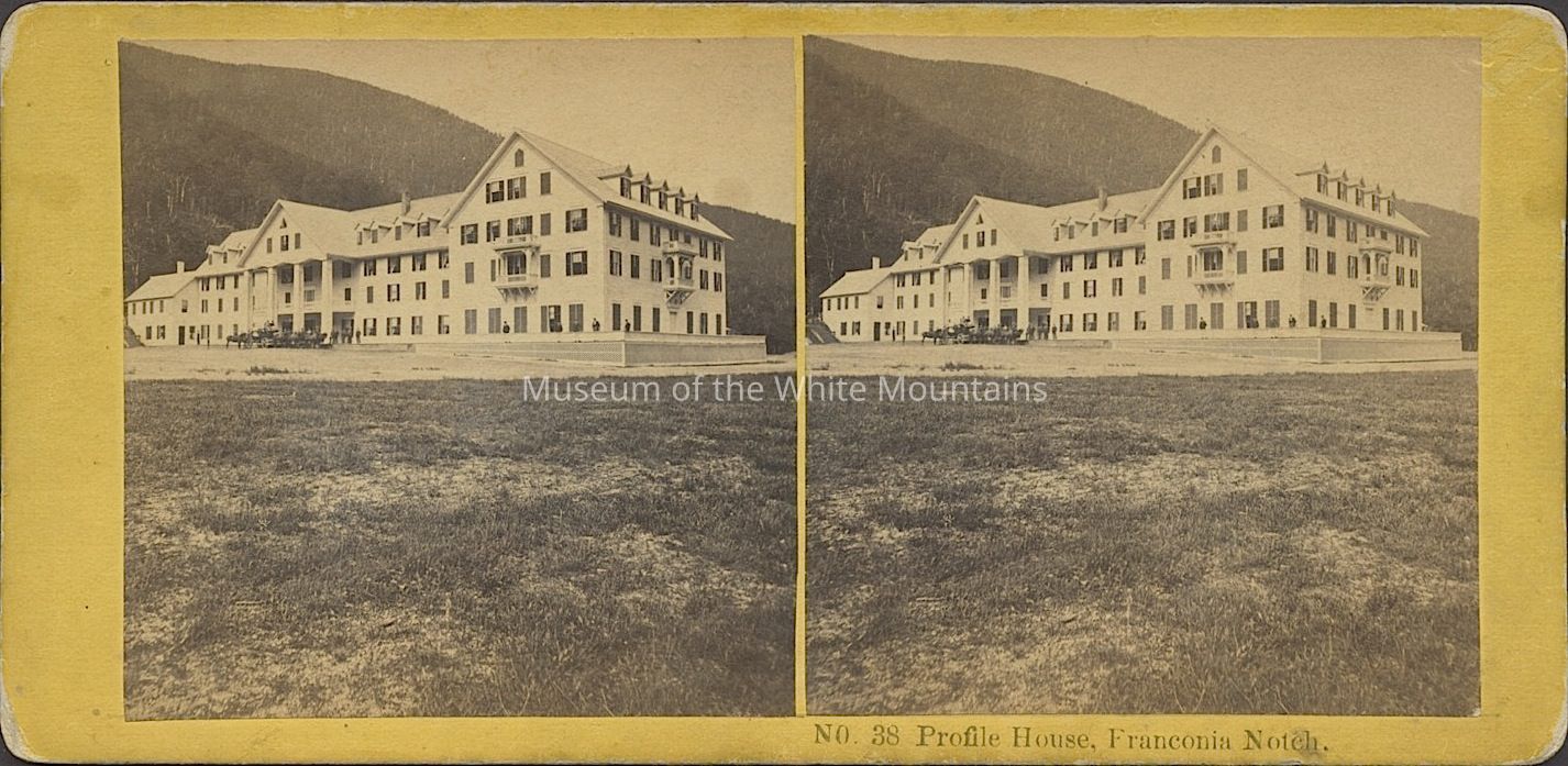 Black and white image of a hotel with a large front portico, many dormers and gables and people outside. In the background are mountains. Caption reads, "Profile House, Franconia Notch." Back Description: Plain