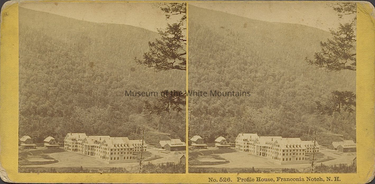 Black and white image of a large hotel with several dormers and gables. It is surrounded by dirt paths and several smaller buildings. In the background is a mountainside. Caption reads, "Profile House, Franconia Mts. NH." Back Description: Plain