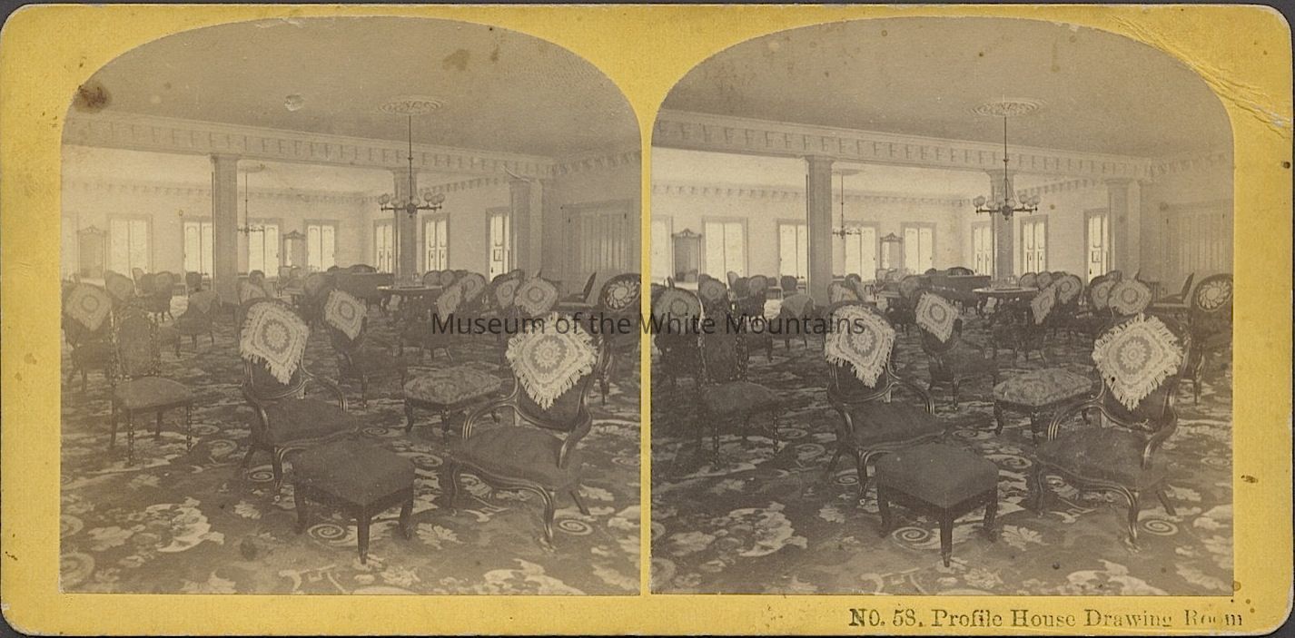 Black and white image of an interior of a hotel. It includes many stuffy chairs and ottomans with a carpet and chandilirs. Caption reads, "Profile House Drawing Room." Back Description: Plain