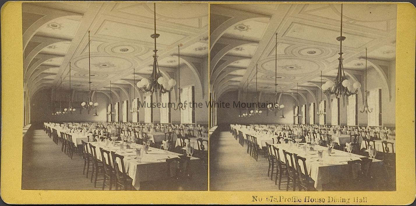 Black and white image of an interior of a hotel. It includes long dining room tables, chairs, place settings and chandiliers. Caption reads, "Profile House Dining Hall." Back Description: Plain. With writing.