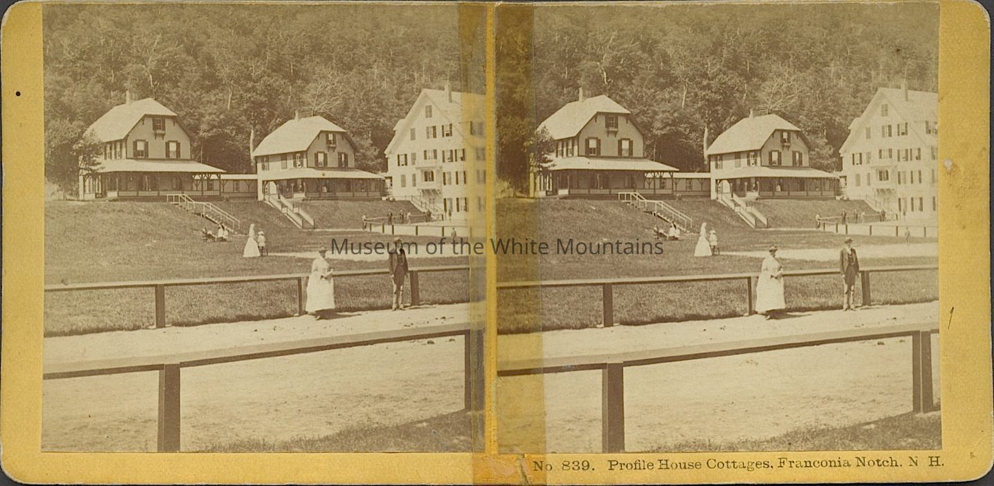 Black and white image of two cottages next to a larger boarding house. Many people are in view. There are clearings and fences in view as well. Caption reads, "Profile House Cottages, Franconia Notch NH." Back Description: Plain