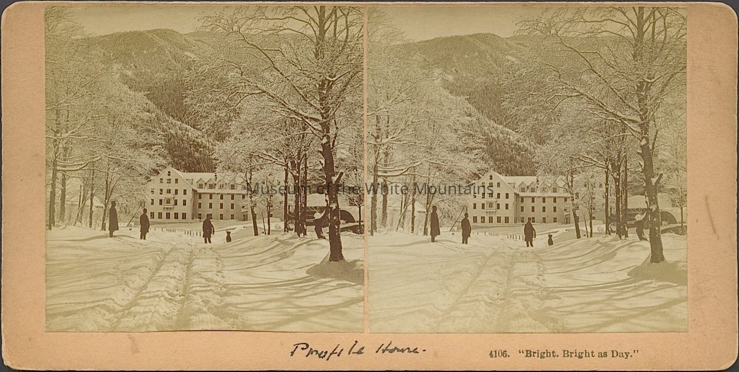 Black and white image of a path in the snow leading to a hotel with many dormers and gables. People are in view. Mountains are in the background. Caption reads, "Profile House; Bright, Bright as Day." Back Description: Plain