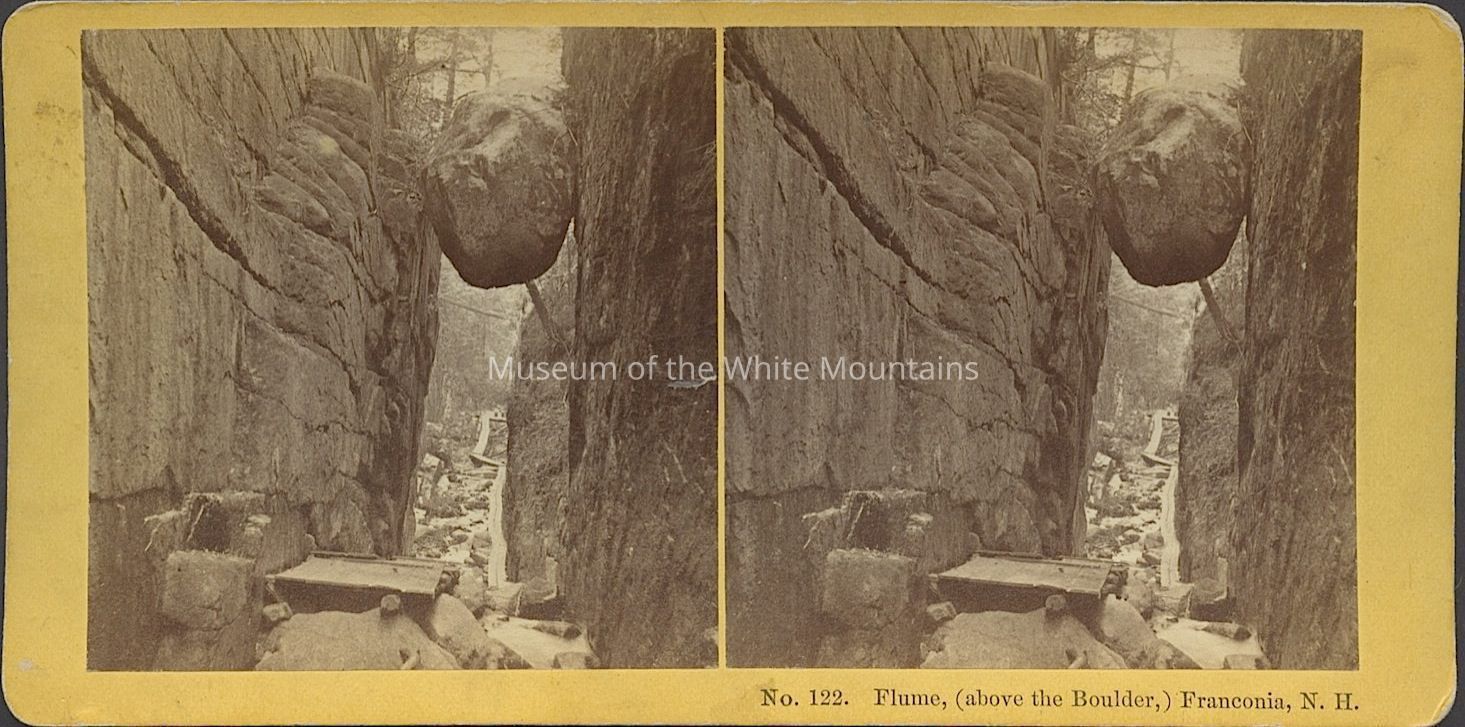 Black and white image of a large rock being held above ground between two ledges. A stream, footpath and trees are in view. Caption reads, "Flume, (above the Boulder) Franconia Notch." Back Description: Plain