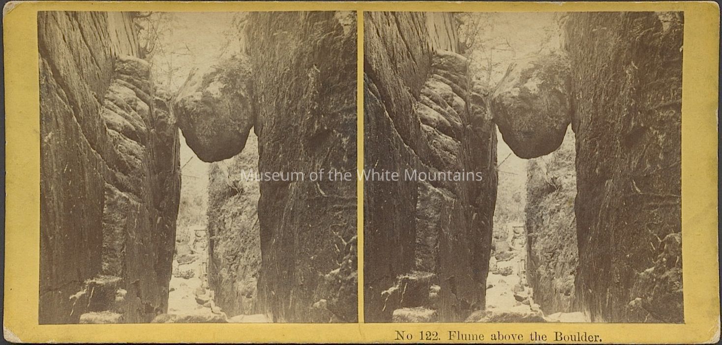 Black and white image of a large rock being held above ground between two ledges. Caption reads, "Flume above the boulder." Back Description: Plain