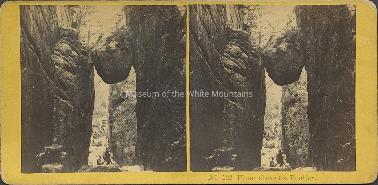 Black and white image of a large rock being held above ground between two ledges. People are in view. Caption reads, "Flume above the Boulder." Back Description: Plain