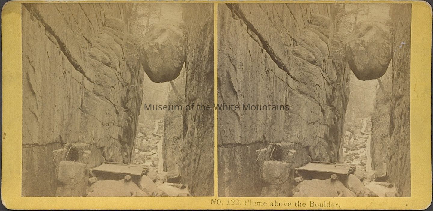Black and white image of a large rock being held above ground between two ledges. A stream and trees and a footbridge are in view. Caption reads, "Flume above the Boulder." Back Description: Plain