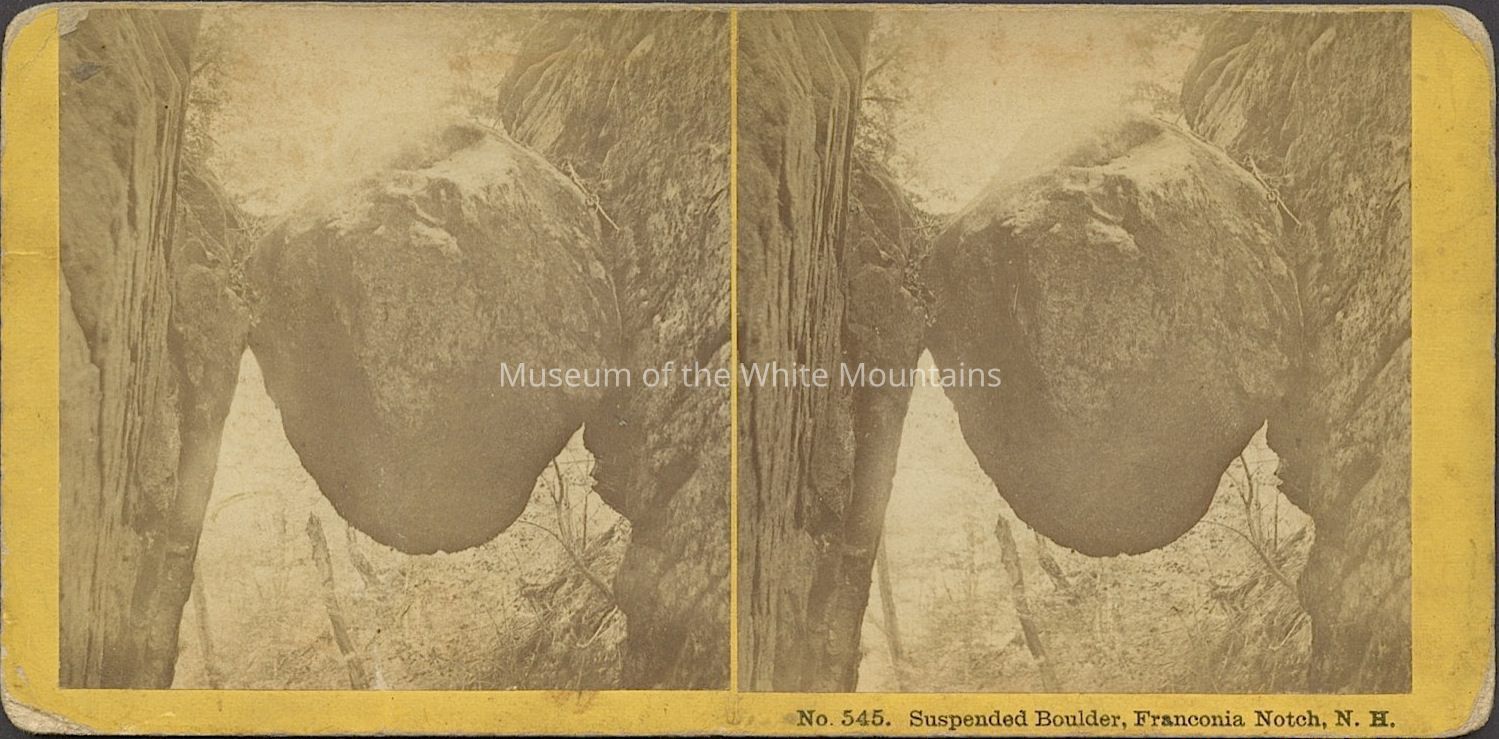 Black and white image of a large rock being held above ground between two ledges. Caption reads, "Suspended Boulder Franconia Notch NH." Back Description: Plain