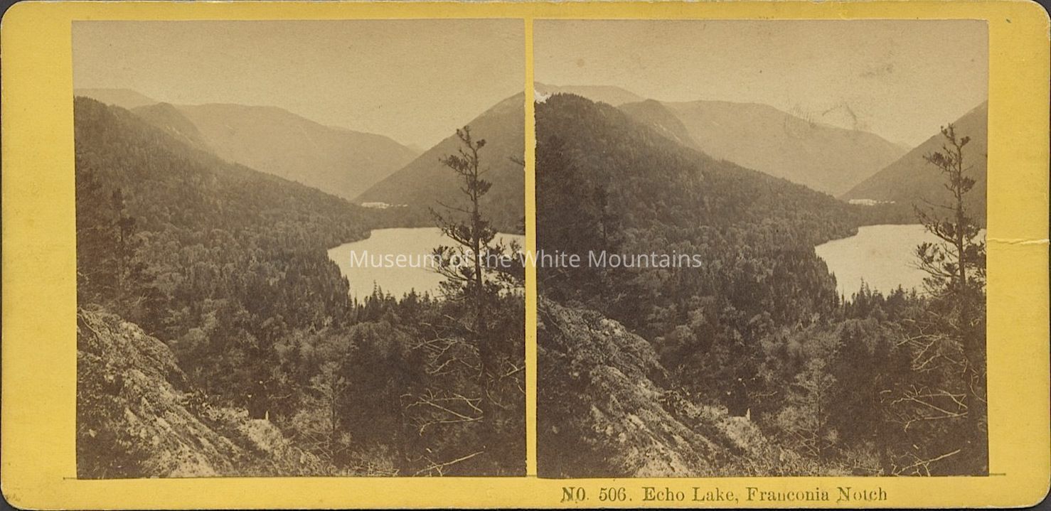 Black and whie image of a lake among trees and mountains. Caption reads, "Echo Lake, Franconia NH." Back Description: Plain