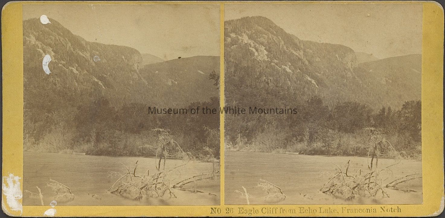 Black and white image of a lake with trees and mountains in the background. Caption reads, "Eagle Cliff from Echo Lake, Franconia Notch." Back Description: Plain