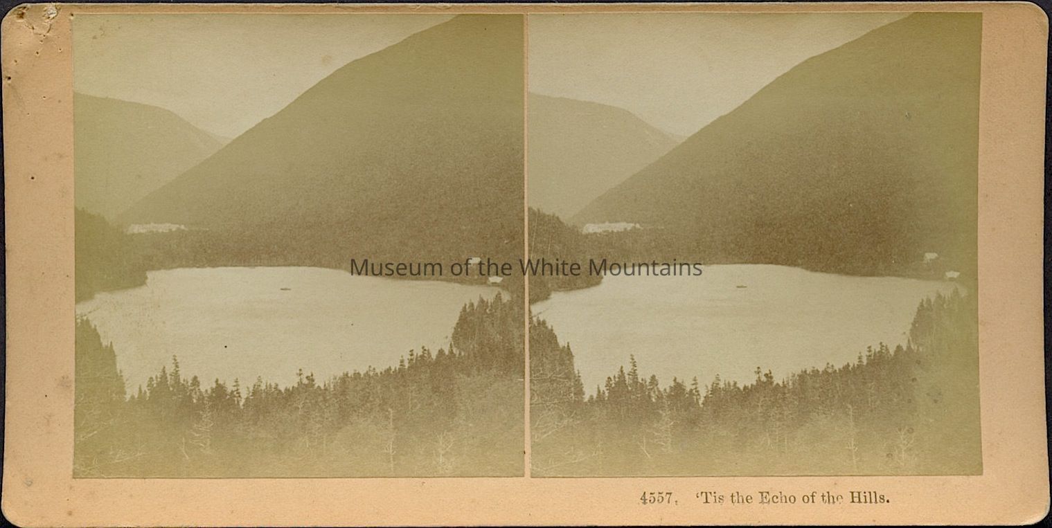 Black and white image of a lake with trees and mountains in the background. Caption reads, "'Tis the Echo of the Hills." Back Description: Plain