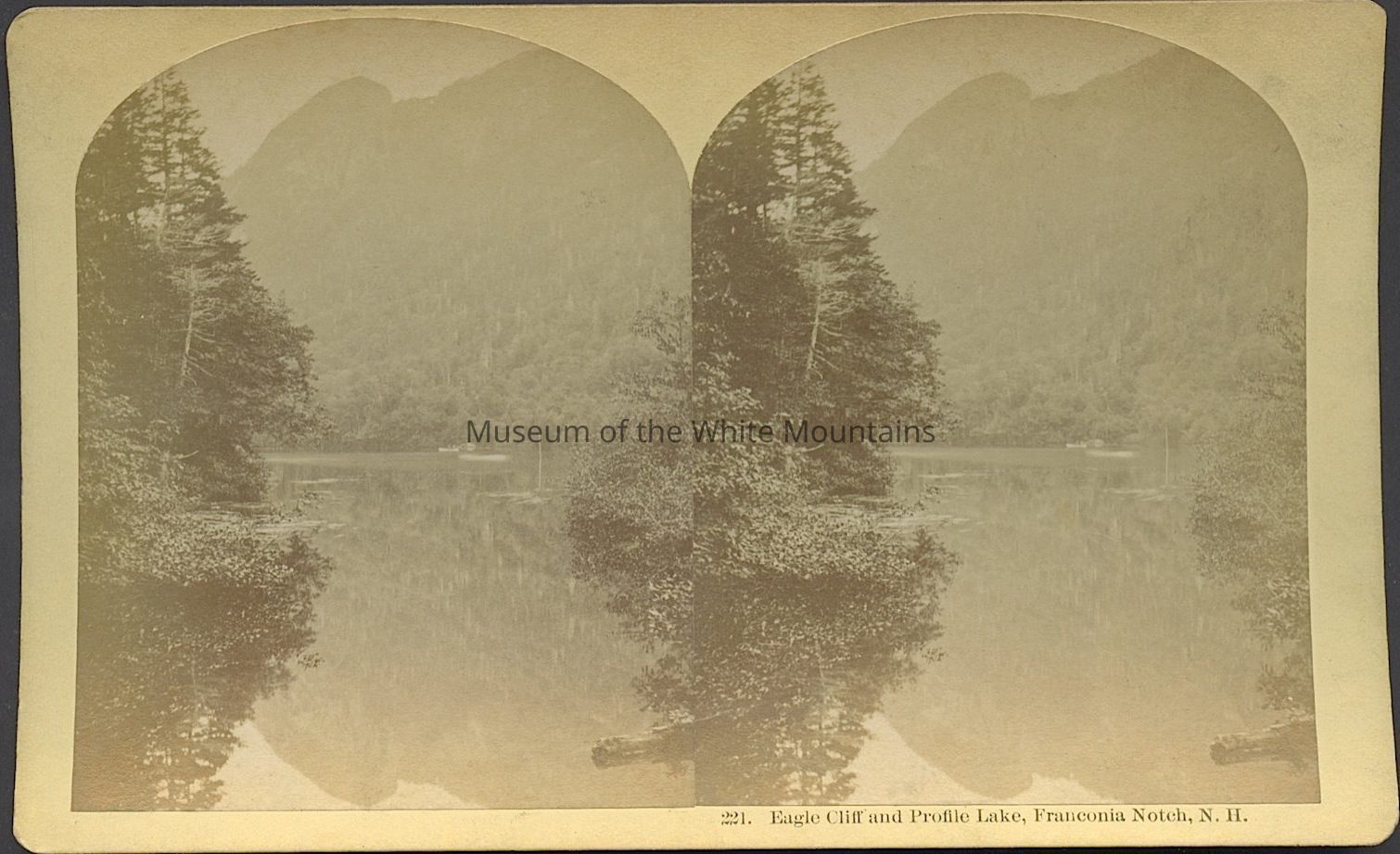 Black and white image of a lake surrounded by mountains and trees. There is a canoe on the water. Caption reads, "Eagle Cliff and Profile Lake, Franconia Notch NH." Back Description: Plain