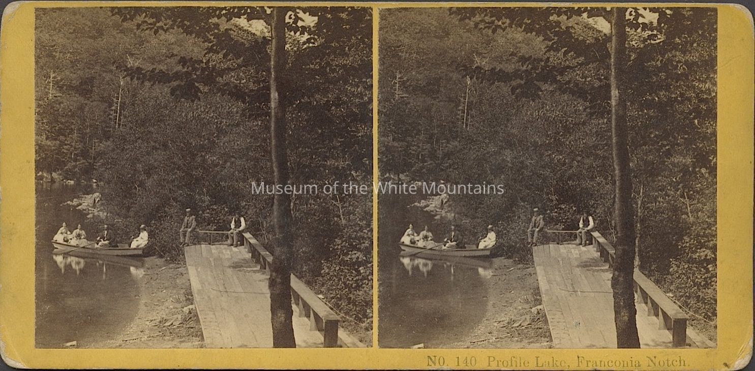 Black and white image of two men on a dock by a lake and several people in a canoe on the shore. Water is surrounded by trees and a mountain. Caption reads, "Profile Lake, Franconia Notch NH." Back Description: Plain