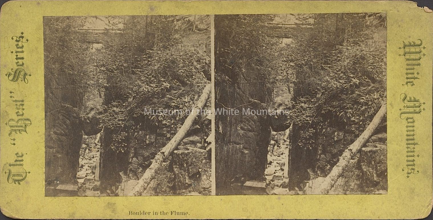 Suspended Boulder (Grafton county, New Hampshire : rock), Flume, The (Grafton county, New Hampshire : valley), Franconia Notch (Grafton county, New Hampshire : valley), Partridge Brothers Apothecaries, Augusta (Kennebec county, Maine : inhabited place), White Mountains (New Hampshire : mountains), rocks, boulders, trees, streams, footbridges, adversisements, drug stores